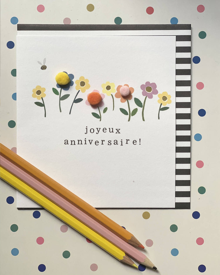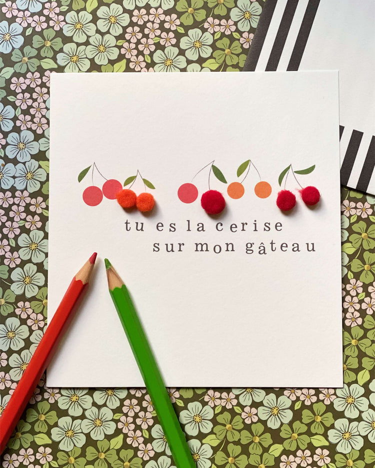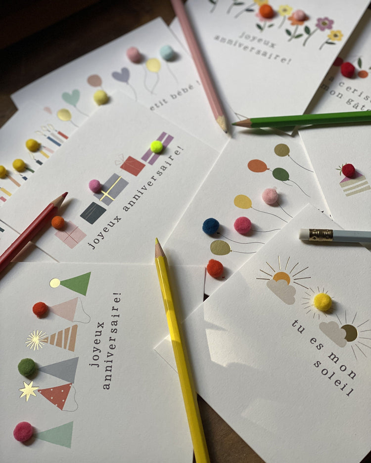 Tous les points de couleurs du designs de la carte sont agrémentés de jolis pompons tout doux qui lui donnent un air de fête ! Une série de cartes festives, joyeuses, pop et pleines de petits pompons.